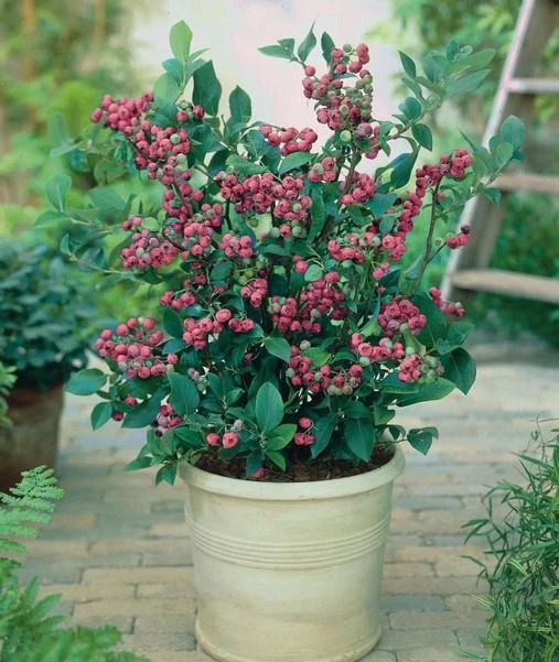 Pink Lemonade remains the first of the newest introductions of “not-blue” blueberries! This innovative variety’s fruit turns a charming solid pink when fully ripe, sometimes with light yellow patching. which makes it a unique and interesting addition in the edible landscape. Bushes grow to 4-5′ tall. Medium-sized berries are mild and sweet with a hint of lemon when ripe midseason. The leaves turn a pretty yellow/orange in the fall. Spring blooms are white with a pink blush, and the winter twig color is red, giving you interesting color in all seasons.